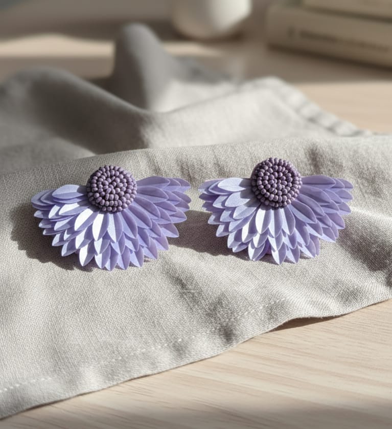 Elevate your everyday style with these Handcrafted Lilac Floral Earrings, designed to capture the beauty of blooming petals in a wearable art form. Each pair features multiple 3D petals arranged in a soft fan-like bloom, complemented by a detailed beaded center that adds texture and depth. The pastel lilac tone gives them a fresh, calming aesthetic—perfect for spring, summer, and minimal fashion lovers.
