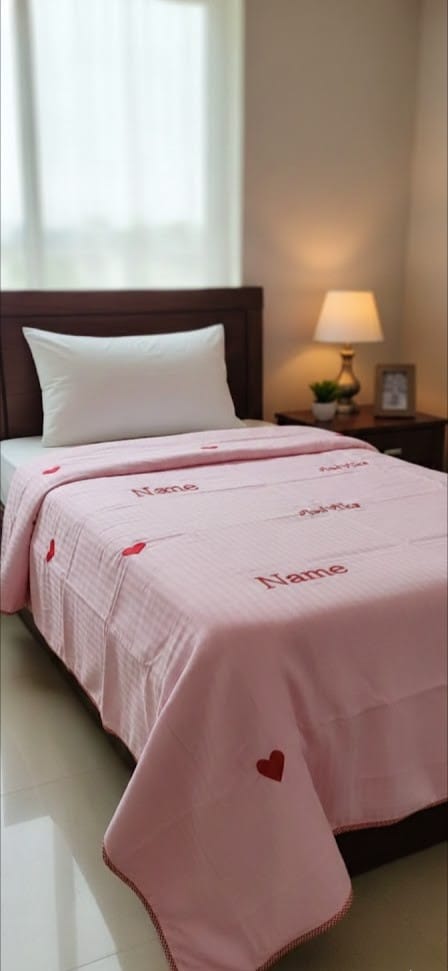 Make bedtime special with this Personalized Pink Embroidered Baby Blanket, thoughtfully designed with cute red hearts and your baby girl’s name stitched beautifully across the fabric. Created using soft, breathable cotton, this blanket offers warmth and comfort without irritation—perfect for delicate newborn skin.